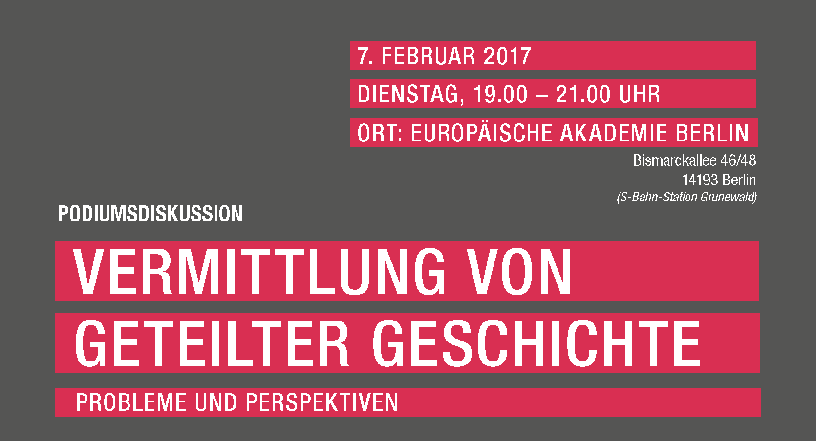 Die öffentliche Podiumsdiskussion ist Teil des viertägigen Seminars »Vermittlung von geteilter Geschichte«, das vom 5. bis 8. Februar 2017 vom Korea Verband in Kooperation mit der Bundesstiftung zur Aufarbeitung der SED-Diktatur, der Europäischen Akademie Berlin und der University of North Korean Studies veranstaltet wird.