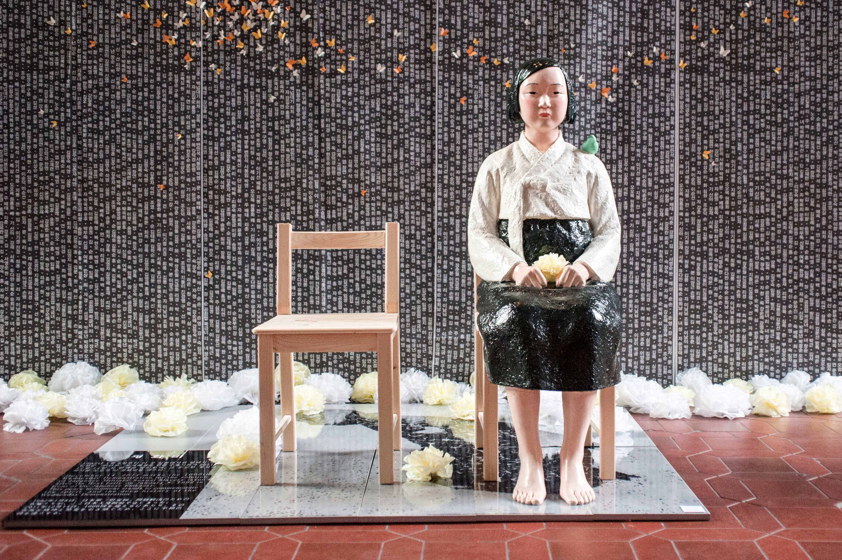 Eine der farbig gestalteten, mobilen Friedensstatuen war bis zum 3. August 2019 auf der Aichi Triennale 2019 zu sehen, eines der größten japanischen Kultur-Events. Sie war dort Teil einer Ausstellung mit dem Titel After „Freedom of Expression?“. Nach massivem Druck durch Politiker, Regierungsanhänger und nationalistische Gruppen wurde die Ausstellung vom Gouverneur der Präfektur Aichi abgesetzt. Dies löste in Japan Proteste aus, da viele den Schritt als verfassungswidrige Zensur ansahen.