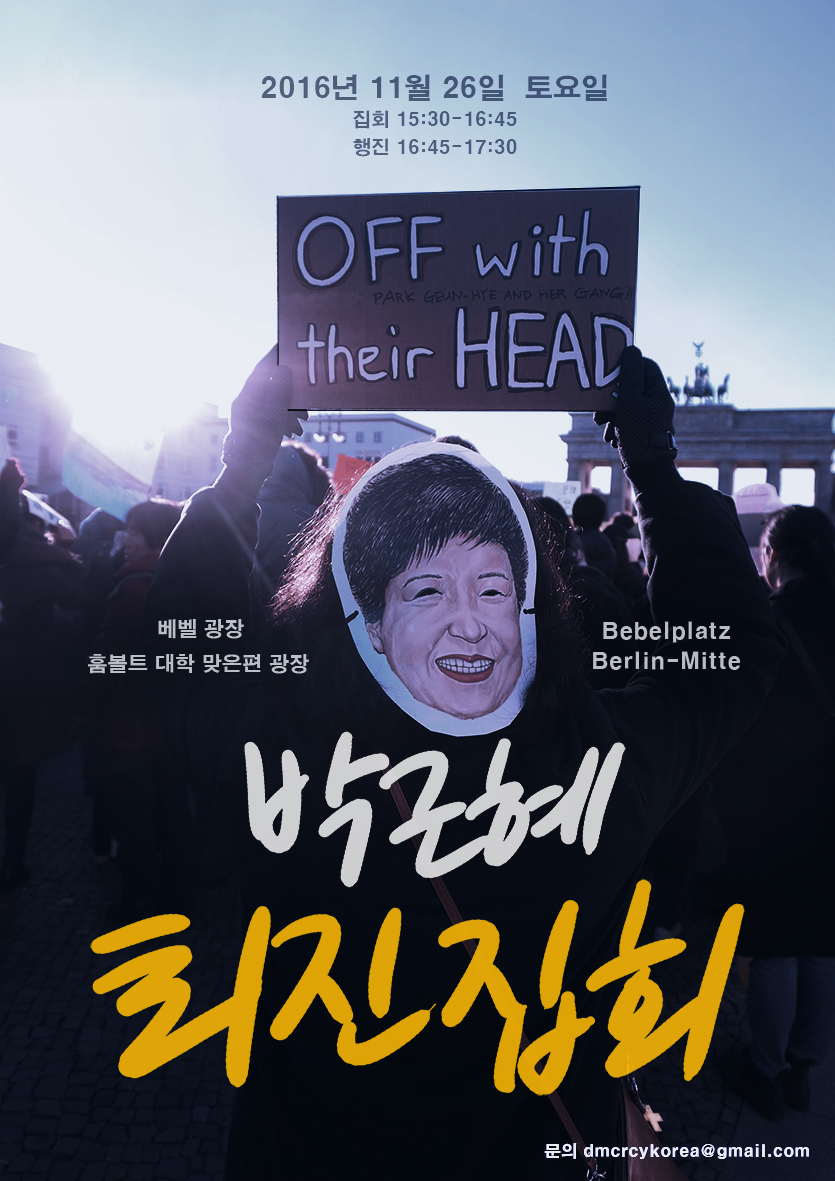 <박근혜 ★탄핵★을 기원하는 올해 베를린 마지막 집회> Letzte Demonstration gegen Park Geun-Hye in Berlin für 2016 (추후 변경사항이 있을 수 있으며, 확정시 수정/공지하겠습니다.) (Es kann noch Änderungen geben, die entsprechend vermerkt werden) 일시: 12월 10일 토요일 15시 Datum: Samstag, 10. Dezember, 15 Uhr 장소: 베를린 쿠담거리 Wittenbergplatz Mittelstreifen Ort: Berlin, Kudamm am Wittenbergplatz Mittelstreifen 집회 내용: 집회 1시간 + 거리행진 거리 행진 경로: Wittenbergplatz -> U bahn Uhlandstrasse -> Wittenbergplatz (30분 예정) ★찬 바람이 적고, 불빛이 즐비한 거리 행진★ Ablauf: Kundgebung (ca. 1 Stunde) und danach Protestmarsch vom Wittenbergplatz zur U-Bahn-Haltestelle Uhlandstraße und zurück (ca. 30 Minuten). Es wird weniger windig sein als beim letzten Mal und durch die Weihnachtsbeleuchtung ist es auch schön hell. 준비물 및 도움 주실 사항: 촛불앱 혹은 LED초 (핫팩, 방석 등) 가져오시면 좋습니다. 노래, 퍼포먼스, 자유발언 등 참여해주실 분들의 연락을 기다립니다. dmcrcykorea@gmail.com Bitte bringt Kissen zum Sitzen, selbstgebastelte Schilder und künstliche Kerzen bzw. euer Smartphone mit Taschenlampe oder Kerzenlichter-App mit. Auch empfehlen wir euch Wärmendes mitzubringen, wie Tee, Hotpacks, etc. Wenn ihr mit einer Rede oder Performance beitragen wollt, meldet …