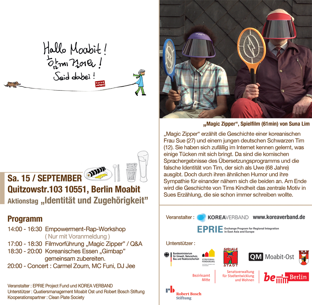 Beim Aktionstag zeigen wir den Film „Magic Zipper“, eine Geschichte über ldentität und eine besondere Freundschaft, bereiten gemeinsam „Kimbap“ zu und werden ein Konzert mit MC Funi und Carmel Zoum haben, inklusive Aufführung des Rapsongs aus dem Workshop.